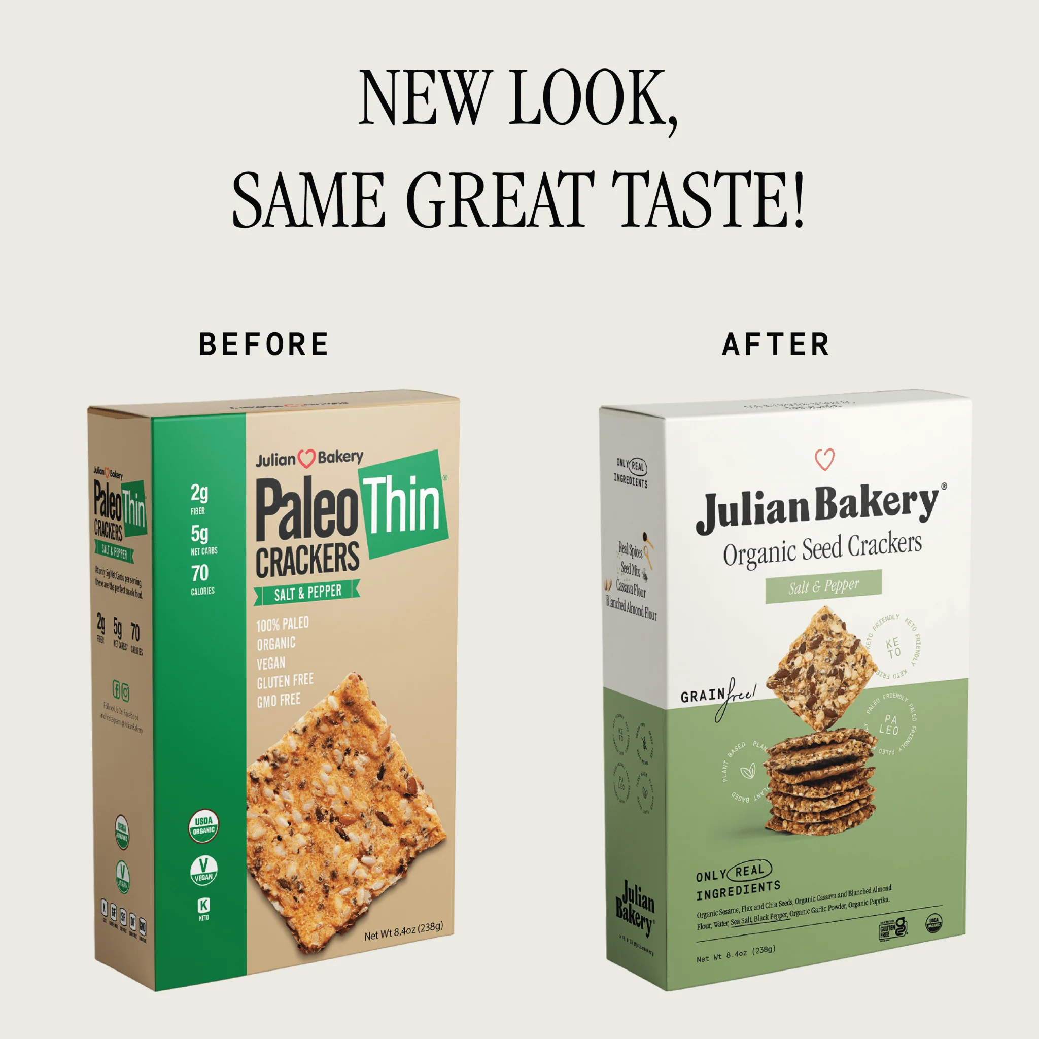 Crafted with a wholesome blend of organic, omega-rich seeds (sesame, chia, and flax), gut-friendly organic cassava flour, and smokey salt & pepper, Julian Bakery Organic Seed Crackers – Salt & Pepper (8.4oz) deliver the perfect crunch.