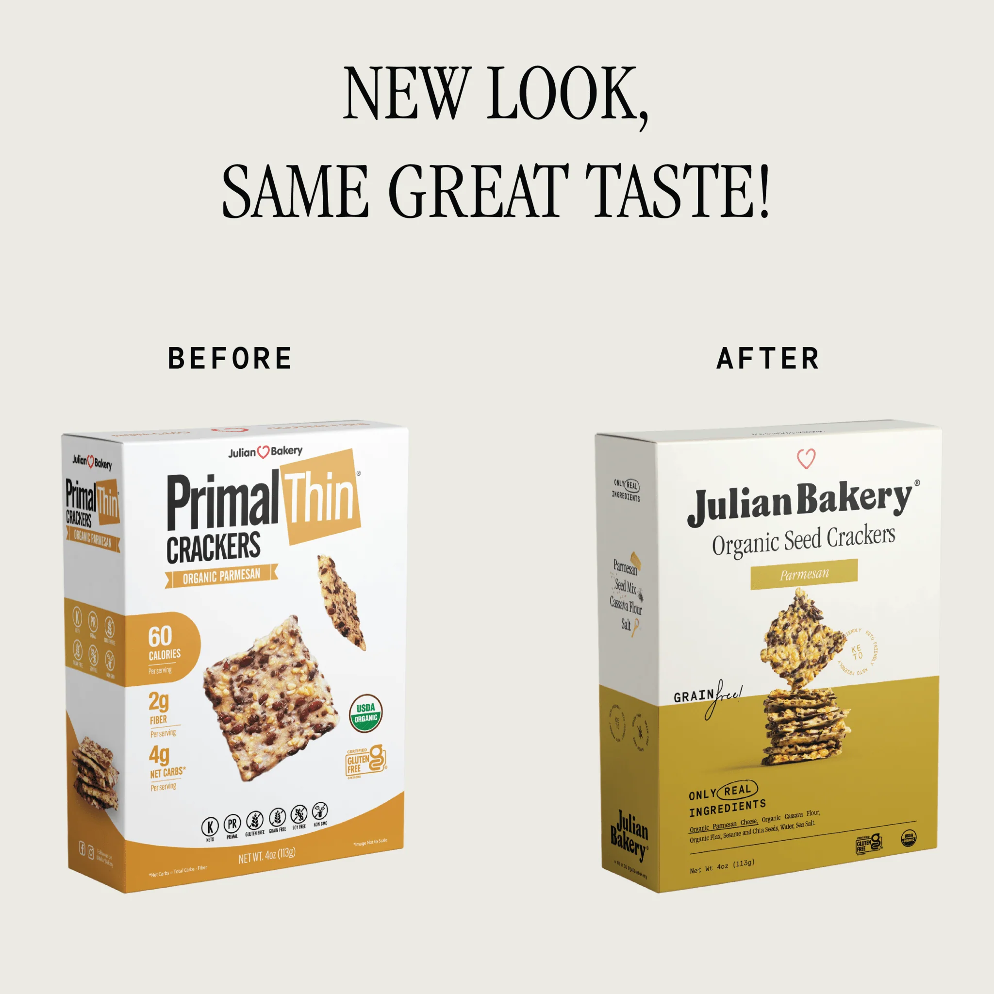 Crafted with a wholesome blend of organic, omega-rich seeds (sesame, chia, and flax), gut-friendly organic cassava flour, and premium organic parmesan, Julian Bakery Organic Seed Crackers – Parmesan (4oz) deliver all the benefits without the drawbacks.
