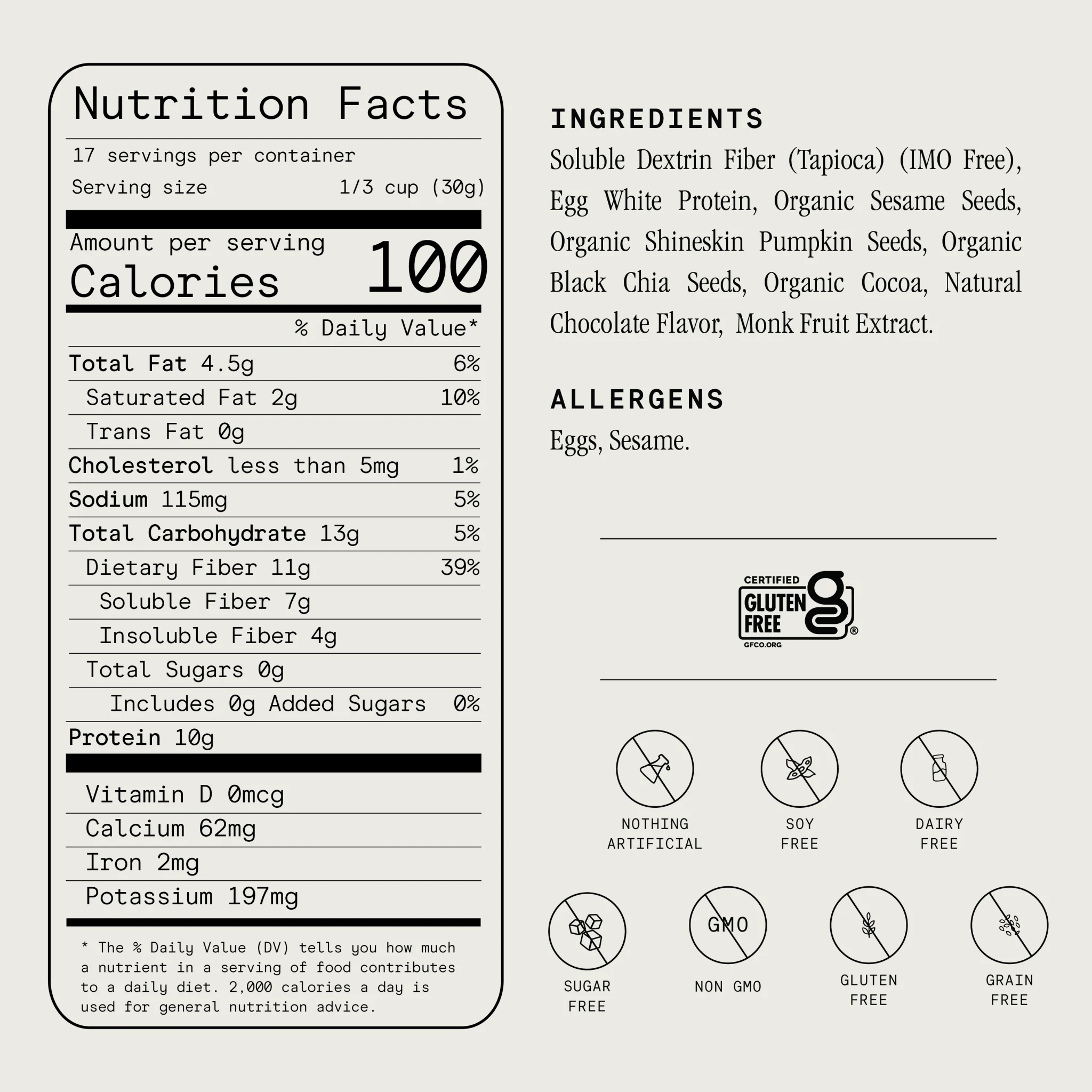 Indulge in your desire for chocolate with ProGranola® Chocolate Cluster, a delightful treat made from egg white powder, sesame seeds, and a blend of organic components. This product is free from gluten, dairy, soy, and GMO, making it suitable for those following a Paleo or Keto diet.